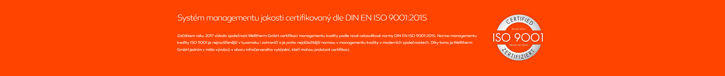 Kromě toho, náš systém managementu jakosti je certifikovaný dle DIN EN ISO 9001:2015. Začátkem roku 2017 získal výrobce certifikaci managementu kvality podle nové celosvětové normy DIN EN ISO 9001:2015. Norma managementu kvality ISO 9001 je nejrozšířenější v tuzemsku i zahraničí a je proto nejdůležitější normou v managementu kvality v moderních společnostech. Díky tomu je výrobce infrapanelů Heatwell jedním z mála v oboru sálavého vytápění, kteří mohou prokázat tuto prestižní certifikaci.