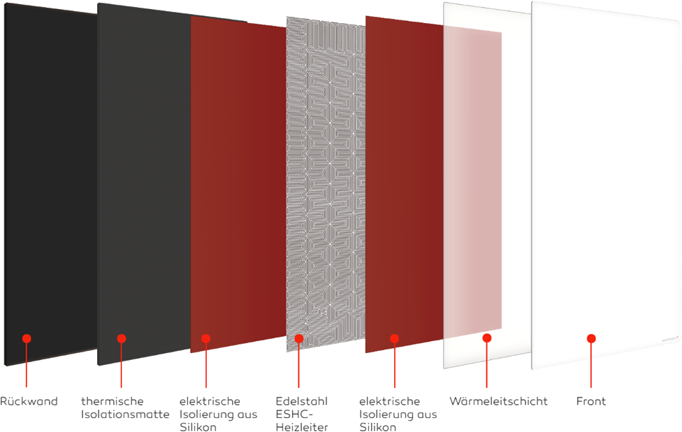 Skladba skleněného infrapanelu níže ukazuje schematickou strukturu skleněných infrapanelů s technologií ESHC. Geometrie topného vodiče ESHC pro celou oblast vyrobená z vysoce kvalitní nerezové oceli ve středu jasně viditelná. Otočné topné okruhy snižují nežádoucí magnetická pole na minimum. Topné těleso je na přední a zadní straně rámováno tepelně odolnou silikonovou izolací. Tloušťka materiálu této izolace pouhých 0,8 mm vede k optimálnímu přenosu tepla do přední části infrapanelu s maximální elektrickou bezpečností. Abychom co nejvíce snížili ztráty tepelné energie vyzařované zezadu, používáme tepelně stínící izolační desku.